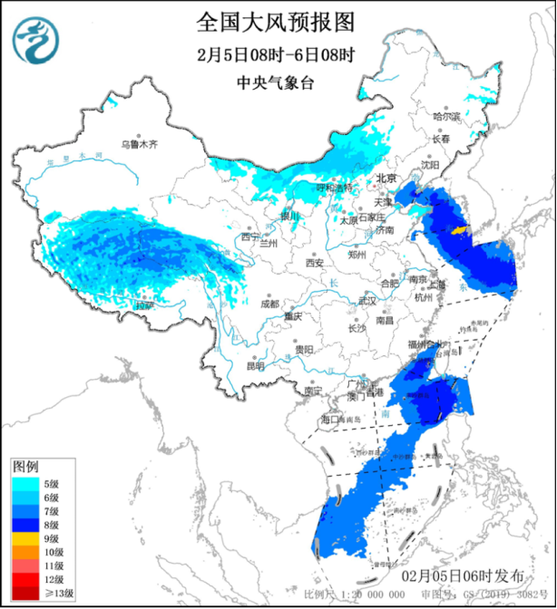 今晨中央气象台升级发布大风黄色预警:5日,西藏中北部、青海南部、内蒙古中西部、华北北部等地部分地区有5~6级、阵风7~8级的大风,其中,西藏中北部、青海西南部的部分地区风力可达6~8级、阵风9~11级;渤海、渤海海峡、黄海大部海域、东海北部海域、台湾海峡、巴士海峡、南海东部和西南部海域将有7~8级、阵风9~10级的大风,其中黄海东南部的部分海域风力可达9级、阵风10级。