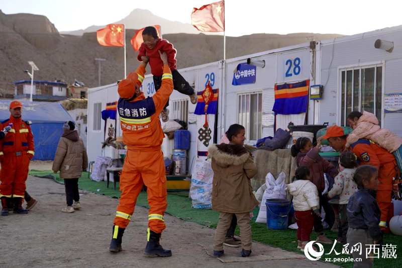 热木青村安置点,消防员们同孩子们嬉戏玩耍。人民网记者 次仁罗布摄