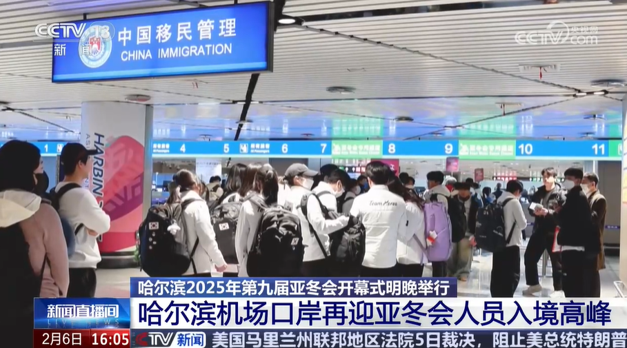 2月5日下午,随着OZ339航班降落哈尔滨太平国际机场,来自韩国、马来西亚、哈萨克斯坦等7个国家和地区的51名亚冬会人员抵达哈尔滨机场口岸入境大厅,在完成边检通关手续后,顺利入境。后续的CZ6086航班上,59名日本代表团人员入境。哈尔滨边检站在入境高峰时开足12条人工通道和8条快捷通道,包含4条亚冬会专用通道,确保入境人员快捷有序通关。
