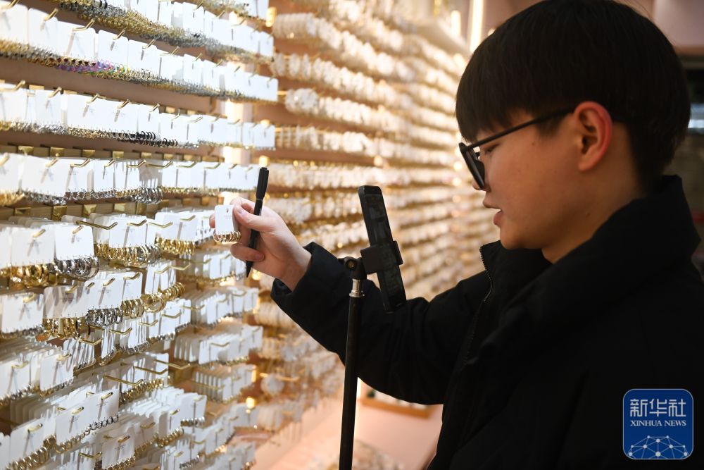 2月9日,义乌国际商贸城的一家饰品店铺工作人员通过手机直播平台销售产品。