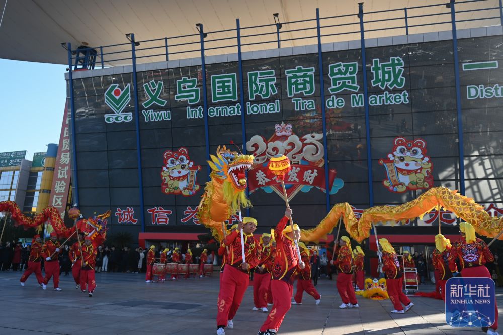 2月9日,舞龙队在义乌国际商贸城的广场进行表演。