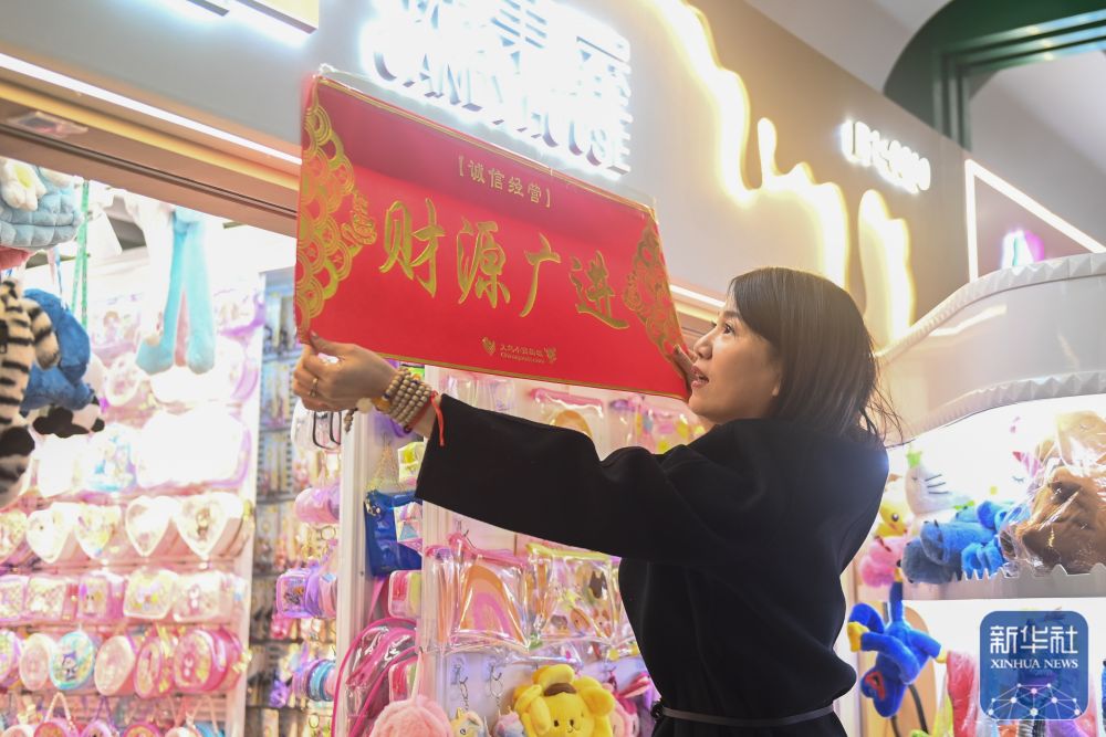 2月9日,义乌国际商贸城的商户在店铺门口张贴领取的新春横幅。