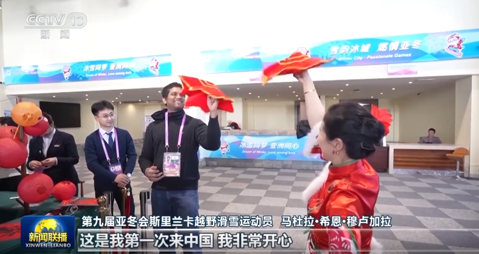 在亚布力雪上赛区运动员村,运动员们制作拓彩冰雪画、捏面塑,感受中国传统文化独特韵味。在猜灯谜环节,工作人员用多国语言设置了不同的谜题,很受欢迎。斯里兰卡运动员穆卢加拉最喜欢东北转手绢,成功转动的一刻他获得全场喝彩。