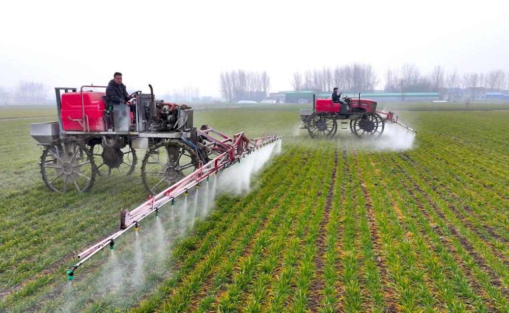 在安徽省亳州市利辛县孙集镇许沟口村,农民驾驶机械进行田间管理(无人机照片)。新华社发(刘勤利摄)