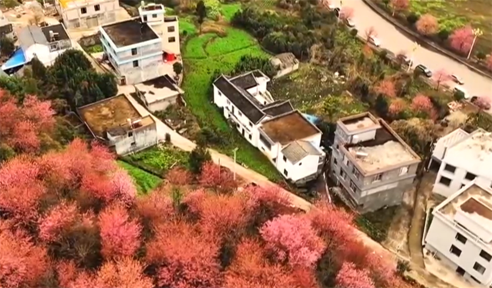 近日,贵州盘州丹霞镇冬樱花迎来绽放,漫山遍野的樱花如诗如画、美不胜收。丹霞镇的冬樱花有的分布在市政大道两旁,有的散落在村寨周围的山丘上,放眼望去,一排排、一片片,春意盎然。
