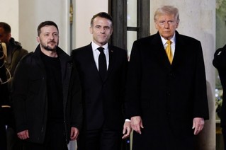2024年12月7日,法国总统马克龙(中)与当时的美国当选总统特朗普(右)和乌克兰总统泽连斯基会晤后走出爱丽舍宫。新华社发(亨利·施瓦茨摄)