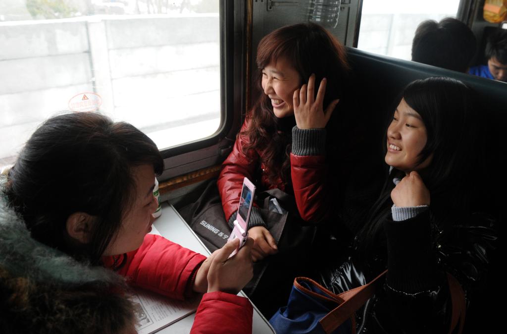 2011年1月21日,在广东东莞电子厂务工的洪永卫(中)、洪娟、谢世曦乘坐L160次东莞东至阜阳的临时列车返回老家(资料照片)。新华社记者 郭晨 摄