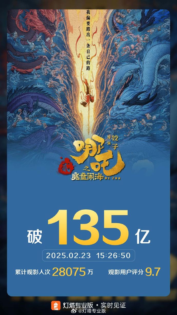 央视网消息:据统计,截至2月23日15时26分,影片《哪吒之魔童闹海》票房突破135亿。