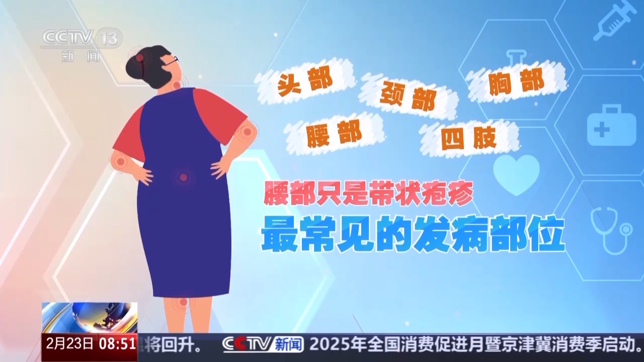 带状疱疹病毒可以在身体任何部位的神经节复制繁殖,比如头部、颈部、胸部、腰部,甚至四肢,腰部只是带状疱疹最常见的发病部位。