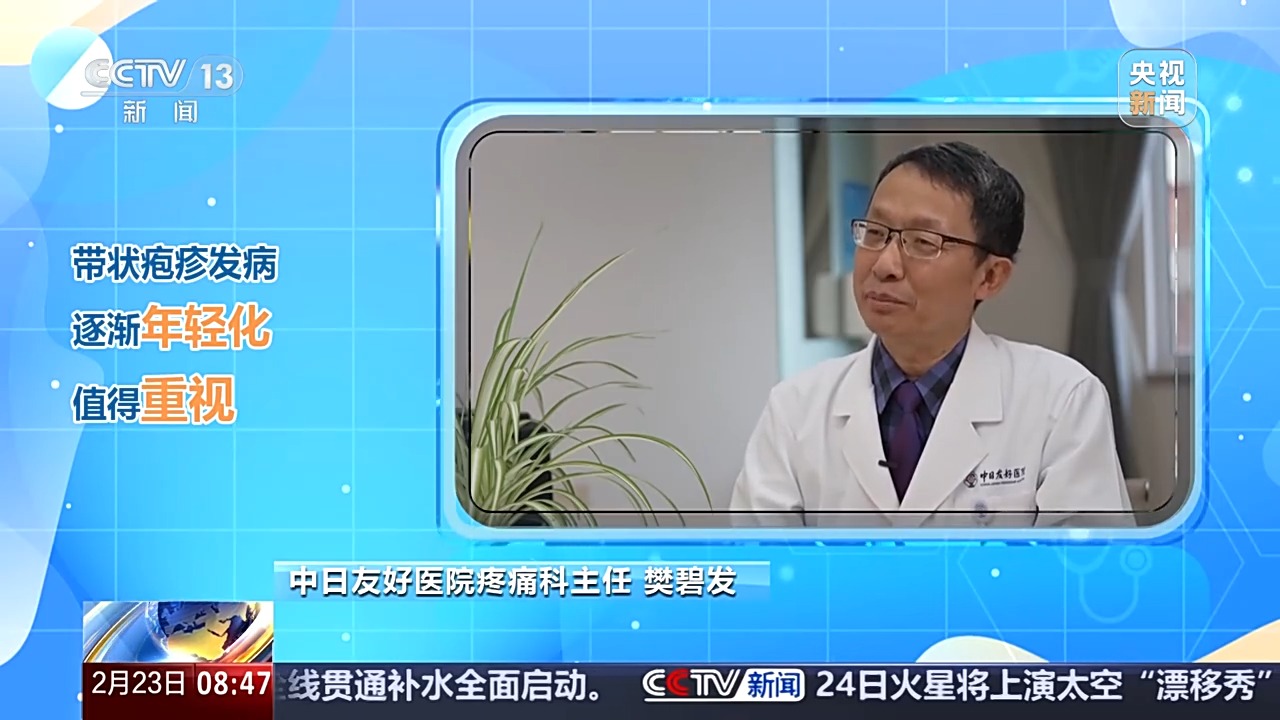 中日友好医院疼痛科主任 樊碧发:50岁以后是多发的人群,但是现在突然发现了,眼下年轻化,像青年人也会逐渐有一些带状疱疹病毒,这是值得我们注意重视的一个倾向。