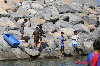 在海边玩耍的孩子们。人民网 塔里克·易卜拉欣摄