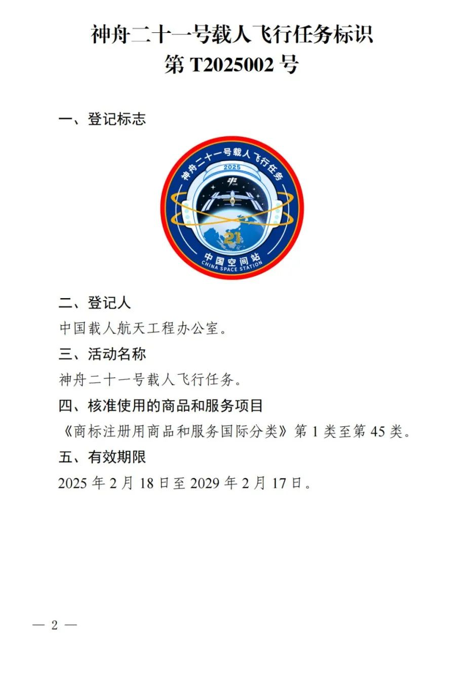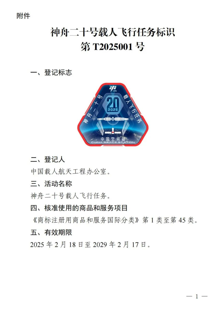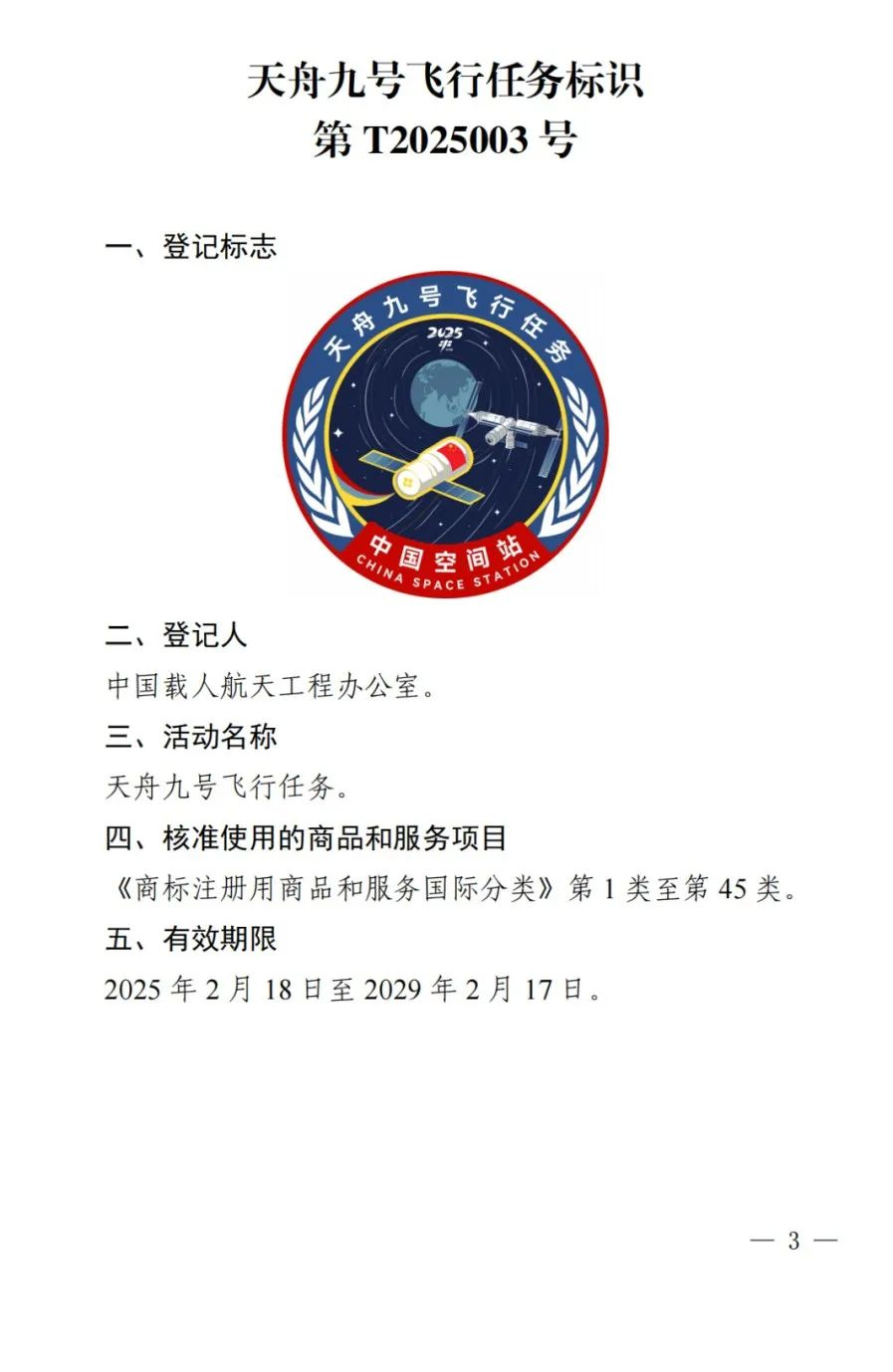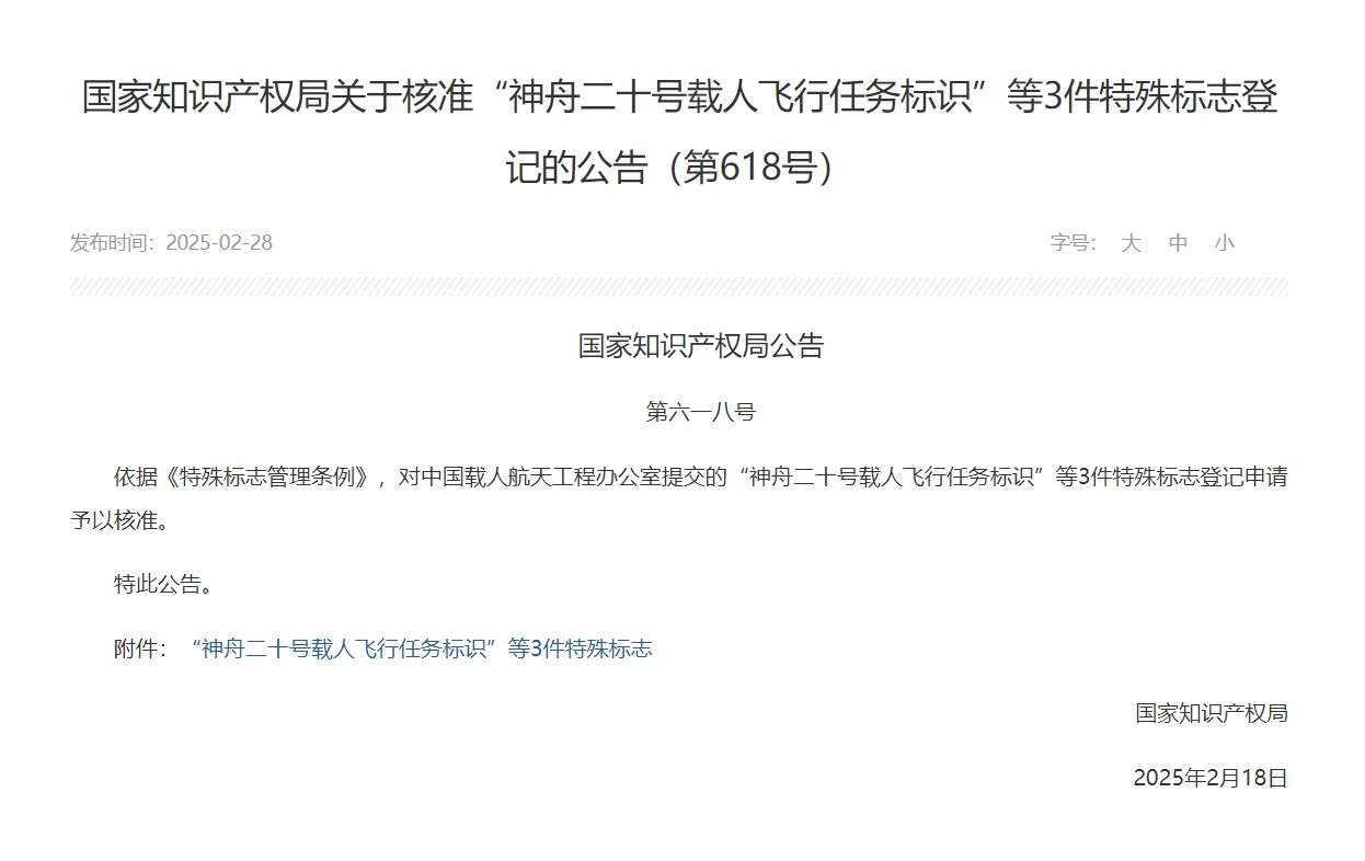 官方“剧透”!国家知识产权局核准3件航天任务特殊标志 来源:央视新闻 2025-03-03 20:30 近日,国家知识产权局对中国载人航天工程办公室提交的“神舟二十号载人飞行任务标识”等3件特殊标志登记申请予以核准,公告全文如下: