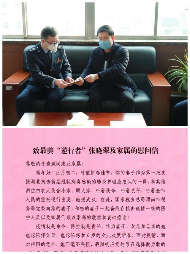医务工作者的顺利出征,离不开家属的理解、支持和配合。获悉这个消息后,渭南市税务局、临渭区税务局两级党委高度重视,分别于1月27日,2月5日对家属进行了慰问,询问了家属在工作生活上有无困难,叮嘱要照顾好两边老人和6岁的女儿,并通过家属向张晓翠表示崇高的敬意和真诚的问候。市局党委书记、局长陈文正要求:应急队员冲峰在防疫一线,单位就是她们的“娘家人”,要对她们的家人要在心理上关心、工作上关爱、生活上关注,像关心自己的亲人一样关心照顾好你的家属子女,全力以赴解决队员的后顾之忧。同时要求,连骁斌同志最近一段时间最大的工作就是照顾好家庭,安排志愿者为他们家庭提供对口服务,生活上的困难,市县局党委都尽最大努力帮助解决,让张晓翠同志安心工作,为打赢疫情防控阻击战再立新功。