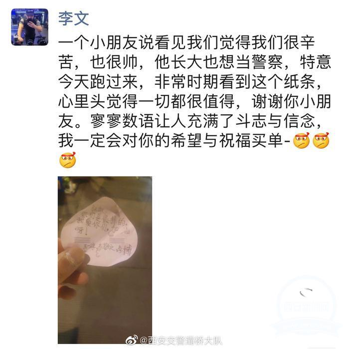 李文告诉记者,小朋友还说看到他们觉得很辛苦、也很帅,他长大也想当警察。“非常时期看到这张纸条,心里觉得一切都很值得。”李文在朋友圈写道“寥寥数语让人充满了斗志与信念,一定不负小朋友的希望与祝福!”