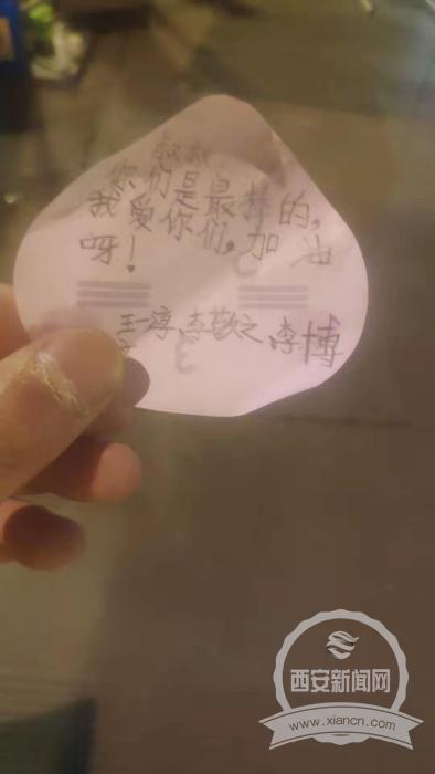 西安新闻网讯(西安报业全媒体记者 袁玥 冯晓瑞)“叔叔,你们是最棒的,我爱你们,加油呀!”1月31日晚,在灞桥收费站防疫检查点执勤的西安灞桥大队辅警李文收到一张特别的心形纸条。孩子的妈妈说,他们在收费站旁的小区住,孩子每天都对着窗台看到民警在执勤,觉得很辛苦,所以执意让爸爸妈妈带他来看看。