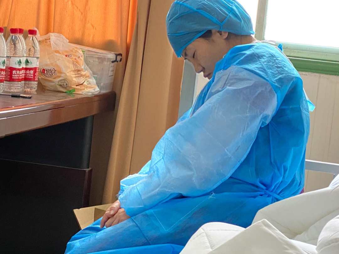 1月22日晚,西安大兴医院紧急接收了首批医学观察人员。已经在岗位工作了两天刚回家的感染科护士李静接到通知立即返回医院,当晚10:30大家进入隔离病区后,连夜消毒,整理物品,接收观察对象,安顿情绪,送餐,记录等等,连续工作超过40多个小时的她回到休息室等待吃饭时,坐着就睡着了。取餐回来的同事不忍心叫醒她,含泪拍下了这一幕。