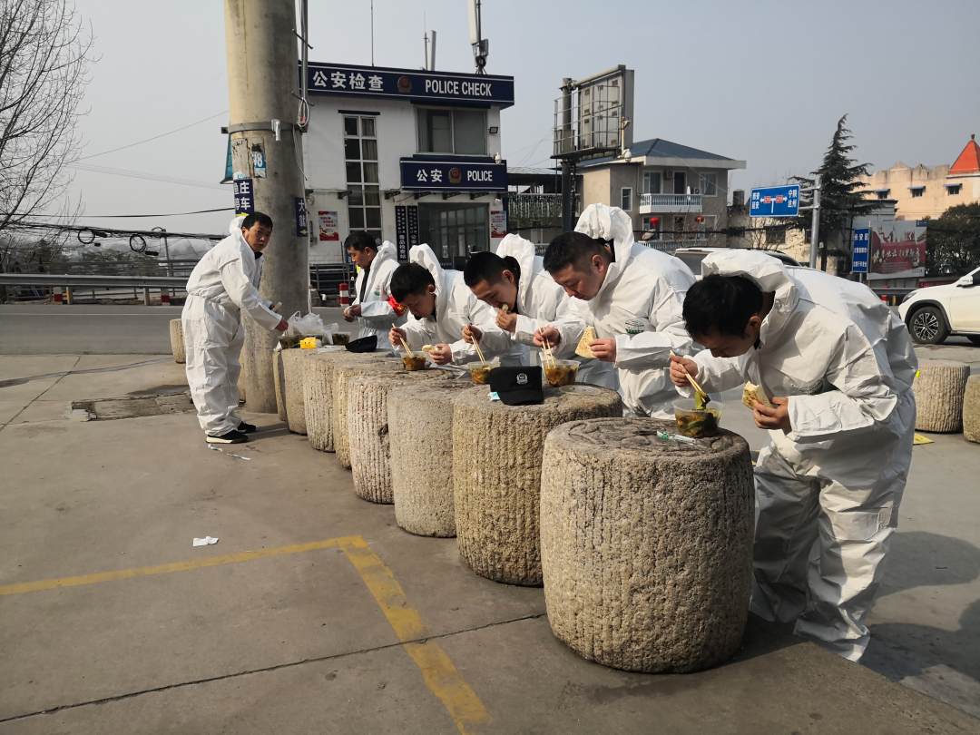 照片中,是公安长安分局滦镇派出所的执勤民警们,在沣峪口检查站连续工作5小时后,由于佩戴防护装备不方便喝水吃饭,且不想因个人原因中断查控检测工作,他们便利用路边的石墩在寒风里吃饭的样子。