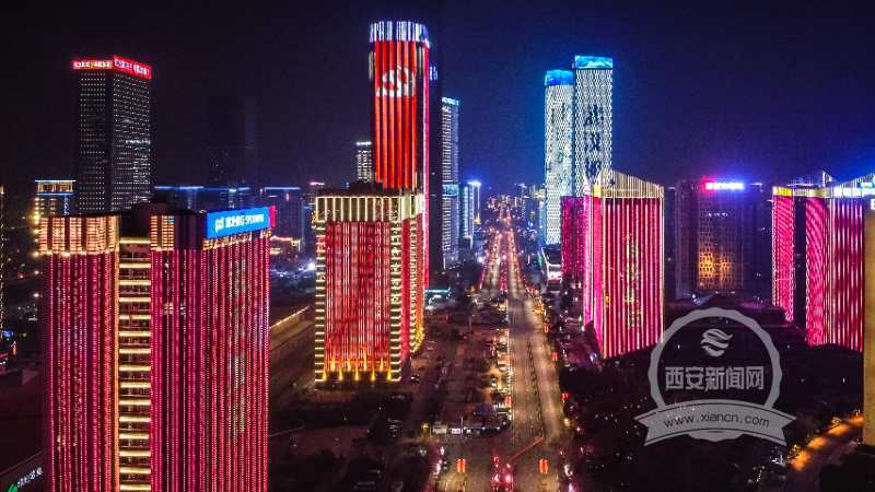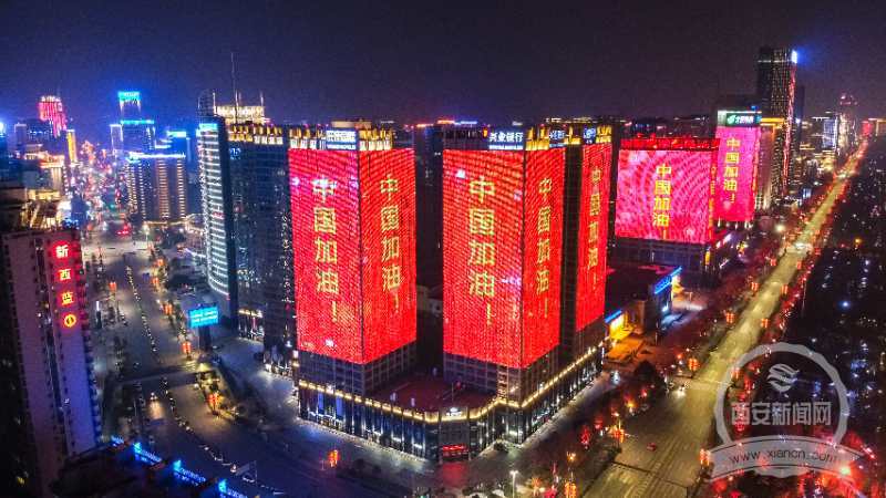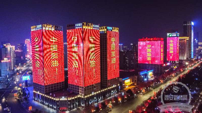 西安新闻网讯(西安报业全媒体记者 文/蒋黛 图/李福民 张曦)2月8日晚,西安高新区唐延路、嘉会坊等区域的12幢建筑醒目地亮起了一句振奋人心的宣传标语。