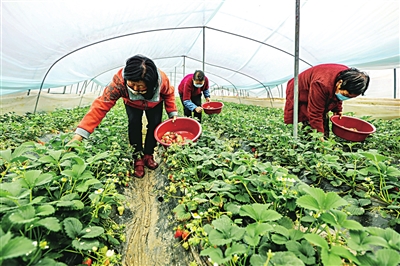 3月6日,鄠邑区一草莓大棚内工人正在采摘草莓