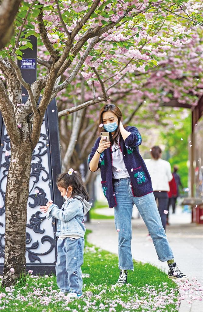 每年的4月都是樱花盛开的时节,在全长1.8公里的西安市曲江池西路两旁,盛开的樱花在春风里摇曳。很多行走在这里的市民,被美景深深吸引,驻足停留,拍照留影,定格粉色的美丽。(记者赵晨文/图)