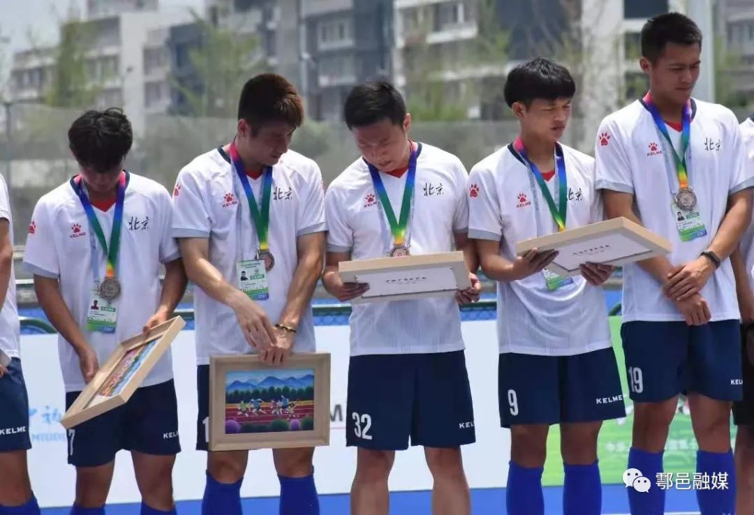 西安体育学院副校长刘新民,鄠邑建设集团有限公司董事长徐朝晖,十四运会曲棍球项目竞赛委员会执行副主任、西安体育学院国资处处长雷振华为男子季军队颁发奖牌、户县农民画及纪念品。