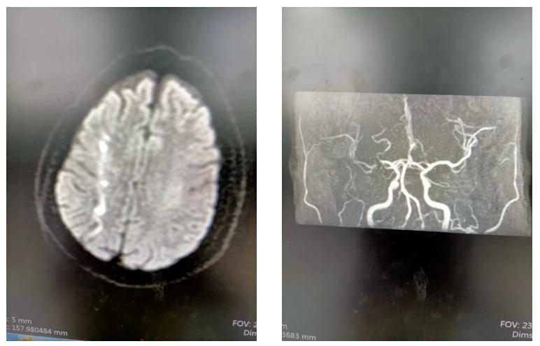 入院时核磁共振显示患者脑部血栓,卒中团队没有放松,术后立即为患者行核磁共振检查,发现右侧大脑中动脉M1段重度狭窄,M1段只剩一条缝隙,患者随时有再次发生大面积脑梗死的风险。神经内科立即向院本部报告患者病情,在与上级医师、患者家属充分沟通病情后,院本部刘福德医生第一时间赶到东院区(阎良区)介入手术室,此时行脑血管造影检查提示,右侧大脑中动脉再次闭塞,预判的风险果然发生了。刘福德医生立即为患者行大脑中动脉取栓手术,并给予球囊扩张+支架植入术,手术过程顺利,血管顺利再通。