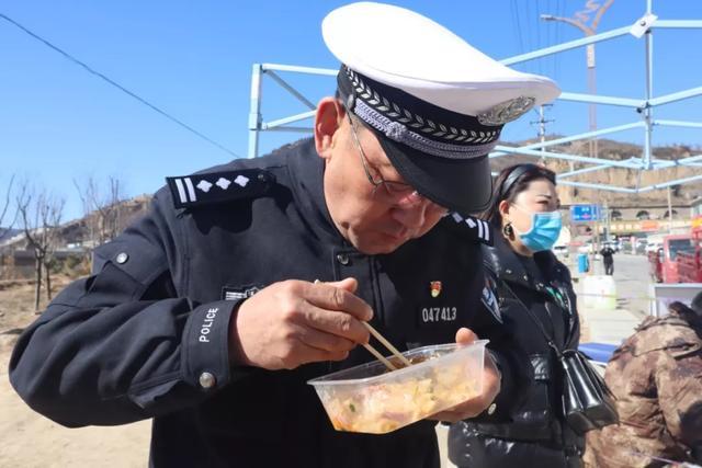 2月17日13点25分,记者来到延川县北新街社区疫情消杀宣传点,看到交警大队大队长高志远和几个民警正在吃着盒饭。高志远告诉记者,这是他们的早饭,这二十几天来,早中晚并一餐,吃冷饭冷菜是常事,今天算不错,中午还能吃上盒饭,有时忙到只能晚上抽时间吃泡面。为了不影响正常工作,忙碌了一上午的高志远端着早已冰凉的饭盒,简单匆忙的吃了几口,又继续投入战斗!