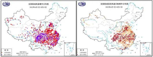 2022年夏季全国极端高温(左)及极端连续高温日数事件(右)分布
