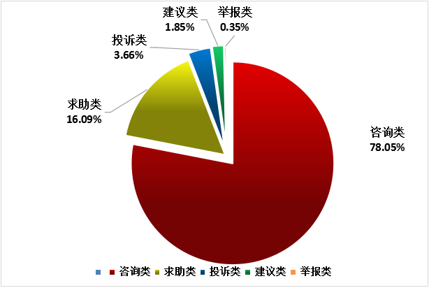 按诉求类别统计,其中咨询类共1557件,占比78.05%,主要涉及疫情防控措施、返程返乡、公共交通、出入证件、企业(个体)复工、物资短缺等问题。求助类共321件,占比16.09%,主要涉及疫情措施、物业管理、供暖等问题求助。投诉类共73件,占比3.66%,主要为市场管理类问题。建议类共37件,占比1.85%,涉及城市管理等问题。举报类共7件,占比0.35%,涉及疫情防控措施等问题。