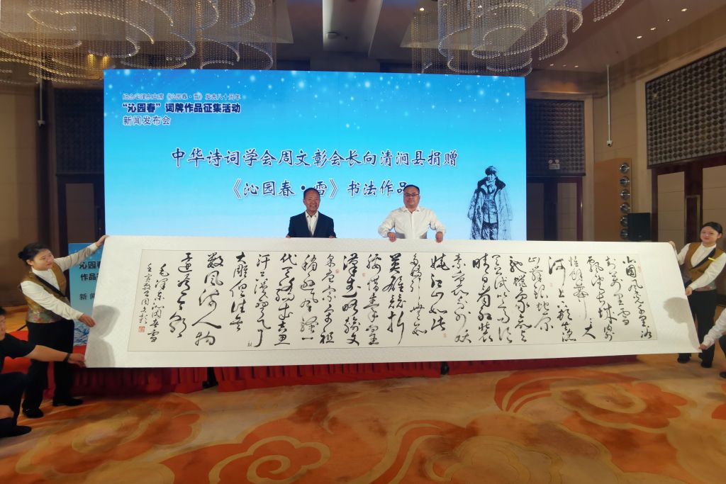 中华诗词学会向清涧县捐赠了《沁园春·雪》书法作品。